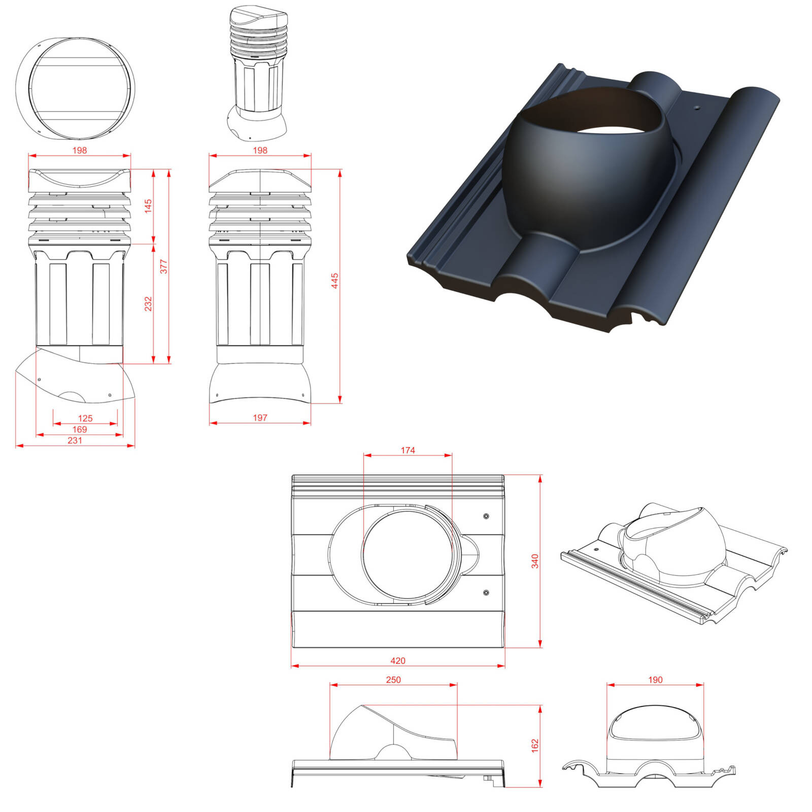 Kompleter Dachlüfter mit Profildachdurchführung ist für die Montage direkt auf Dachsteinen bestimmt. Spezielle ablaufkanäle führen den Kondensat auf die Dachziegeln ab. Das Produkt besitzt eine inklusive Wasserwaage, die Montage einfacher macht. Dank der Click Montage wird die Haube auf der Dachdurchführung stabil und sicher montiert.