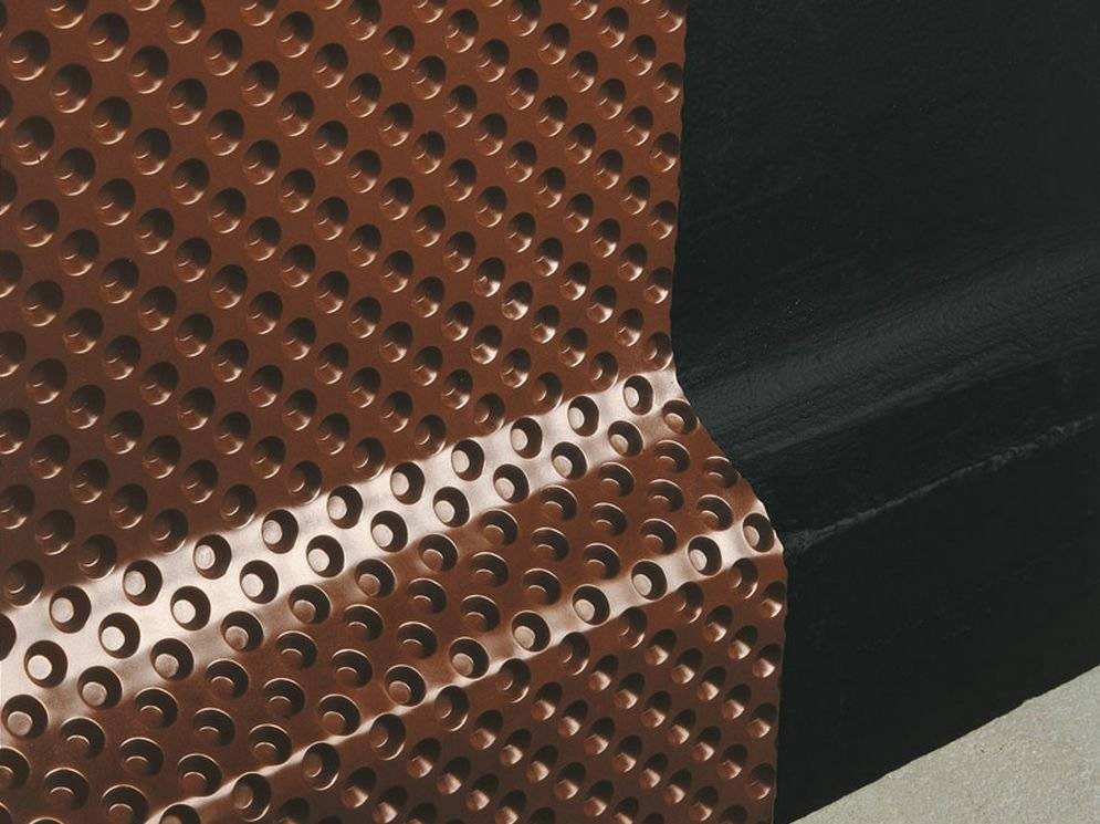 Die Delta MS Noppenbahn gewährleistet durch die zum Mauerwerk gerichteten Noppen eine sichere Trennung von Grundmauer und feuchtem Erdreich. Die Noppen bilden Lüftungskanäle, damit das Mauerwerk atmen kann. Beim Verfüllen wirkt die Delta MS Noppenbahn als Knautschzone. Die Abdichtung wird besser geschützt. DELTA-MS Noppenbahnen haben eine hohe Druckfestigkeit von ca. 250 kN und über 1800 Noppen pro Quadratmeter. Die Noppenbahnen sorgen auch auf Perimeterdämmung für eine günstige Verteilung des Druckes und eine geringe Punktbelastung.