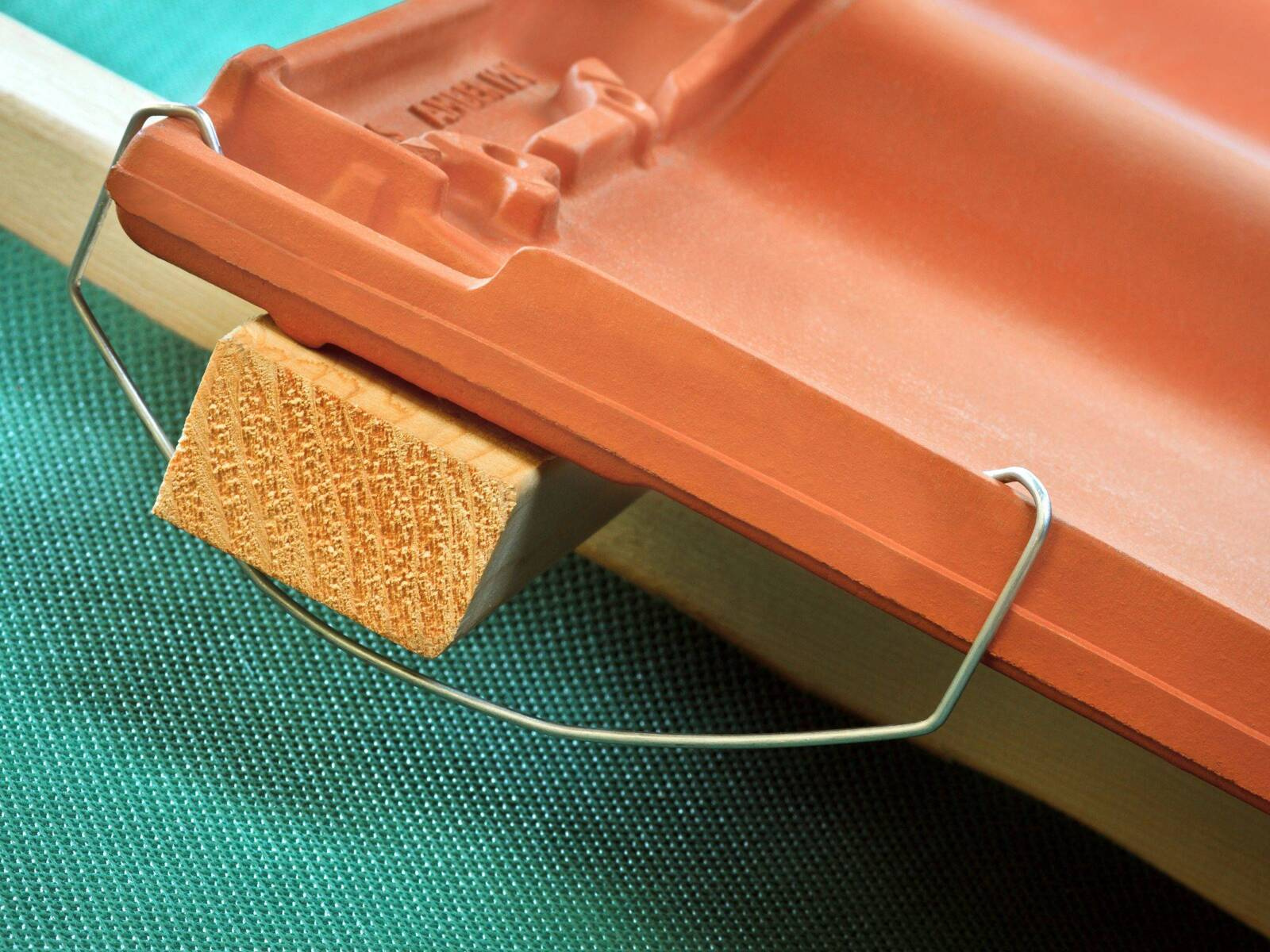 Ein Klammer für sichere Befestigung von Dachziegel an der Latte.