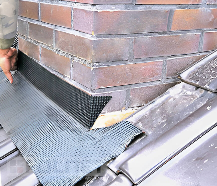 Kaminanschlussband aus armiertes EPDM, vollflächig mit Butylkleber bedeckt.