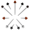 Trapezblechschrauben in 13 RAL-Farben (Kirschrot, Kastanienbraun, Rot, Grün, Anthrazitgrau, Grafitgrau, Hellgrau, Ziegelrot, Braun, Dunkelbraun, Schwarz, Silbermetallic, Weiß) sowie verzinkt ohne Farbbeschichtung.