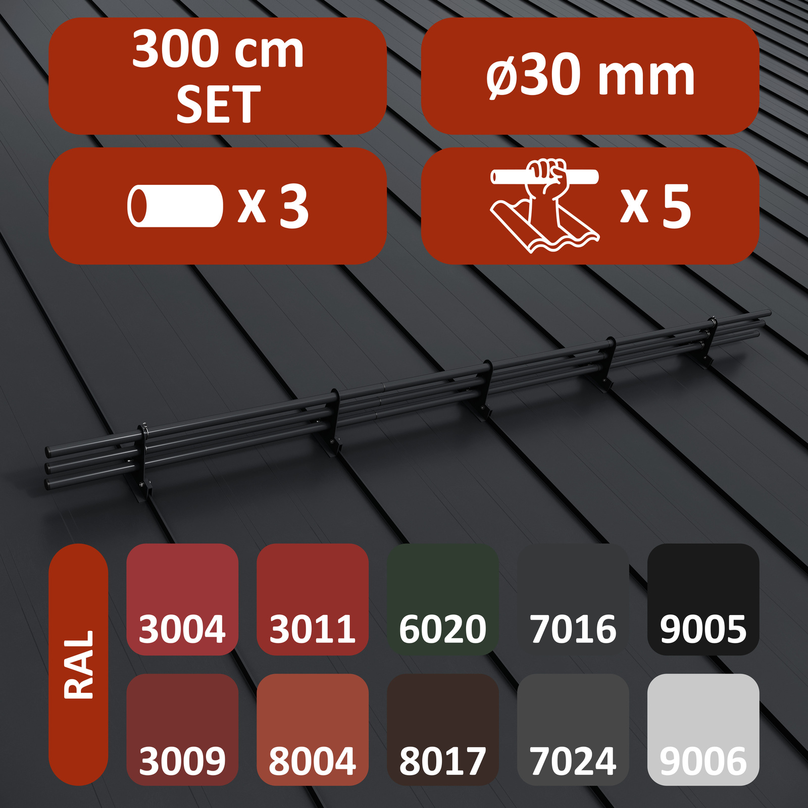 - 9 Schneefangrohre je 1,0 m (100 cm) – Gesamtlänge 3,00 m