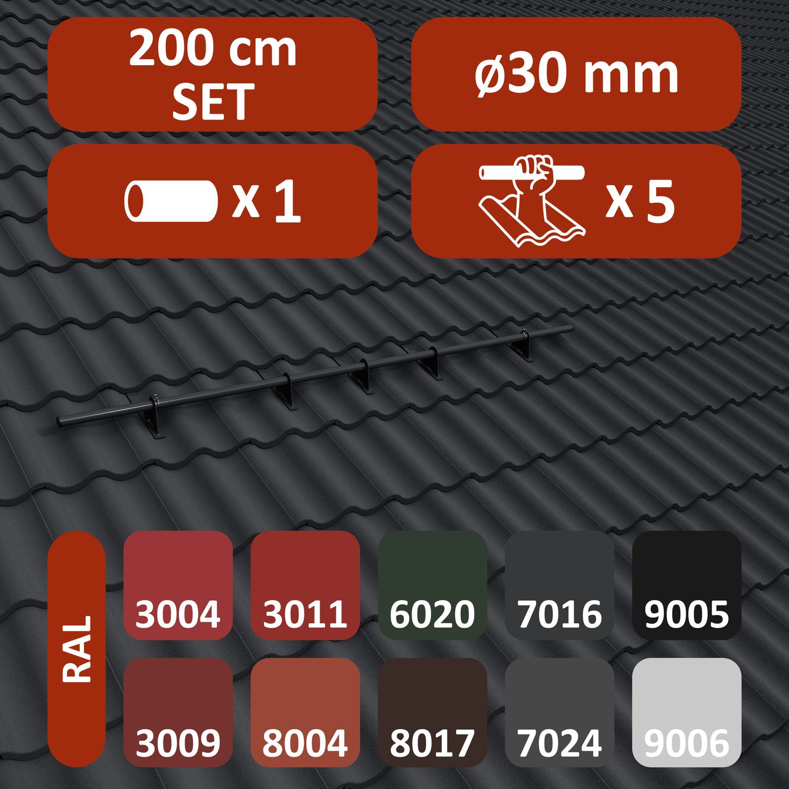 - 3, 4 oder 5 Uni-Stützen (Schneefangstützen) zum Einhängen in Dachziegel/Biberschwanz
