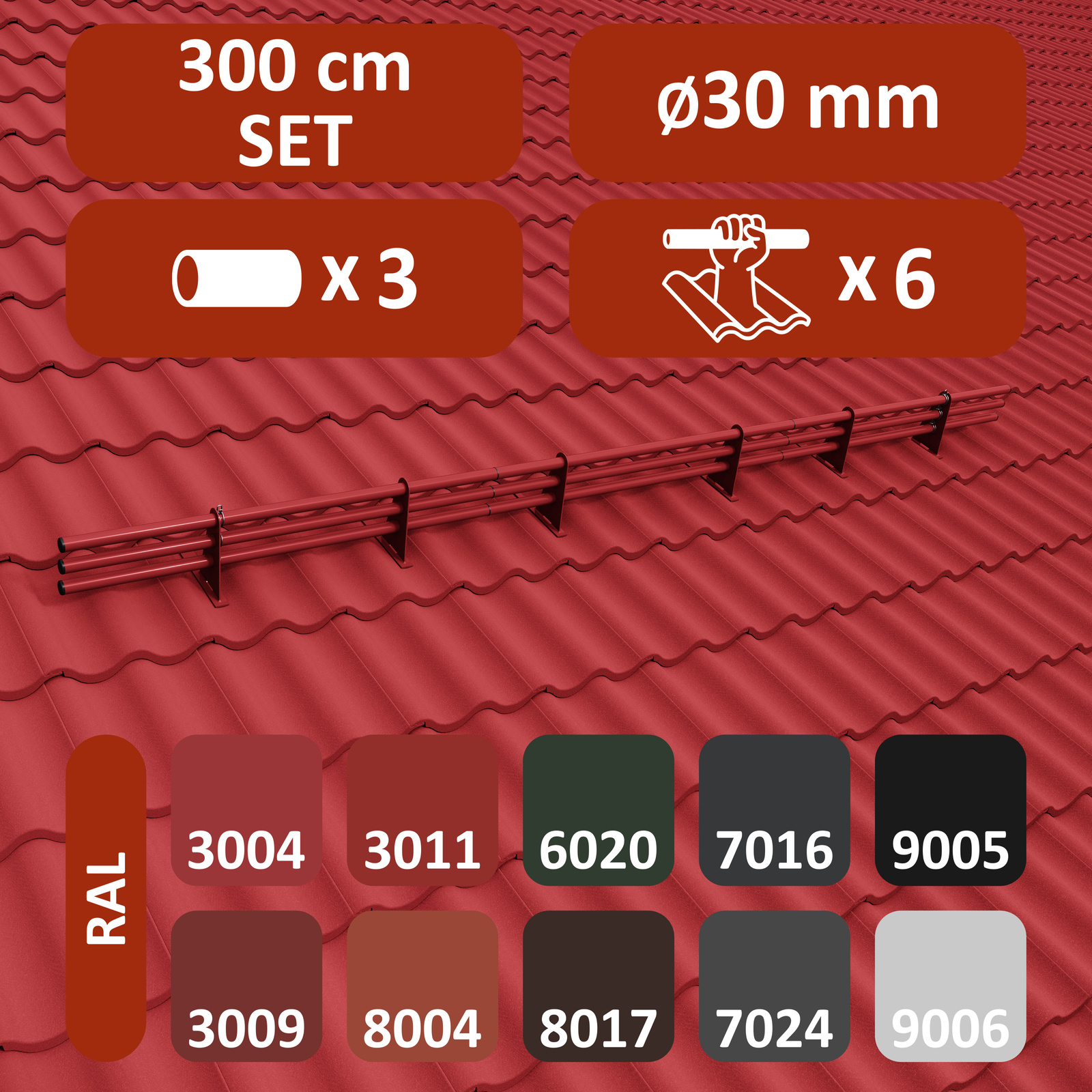 - 9 Schneefangrohre je 1,0 m (100 cm) – Gesamtlänge 3,00 m