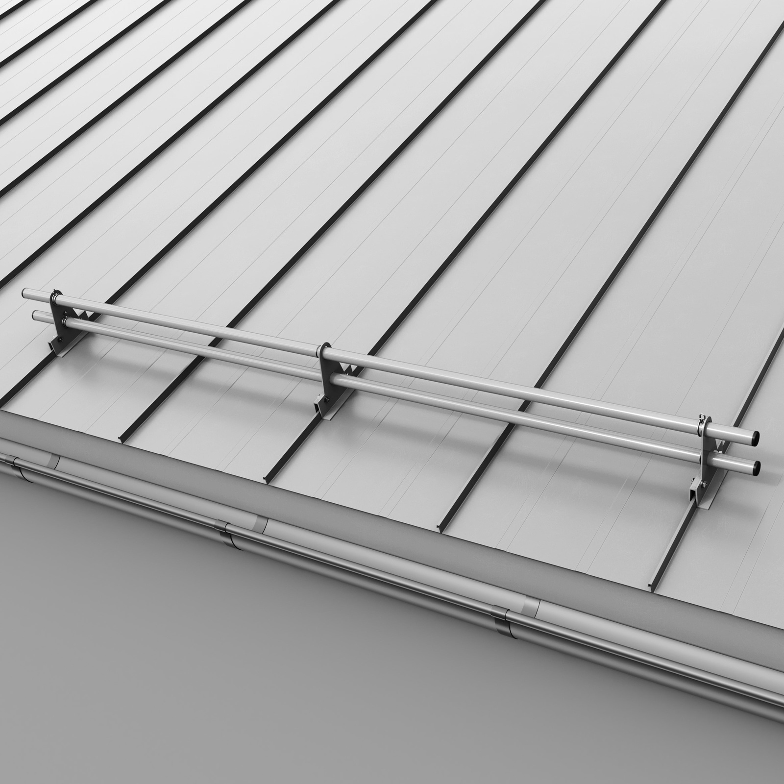 - Montage am Stehfalz – Falzklemmen ohne Bohren, dachhautschonend; Reihenaufbau ein-/zwei-/dreireihig, endlos verlängerbar.