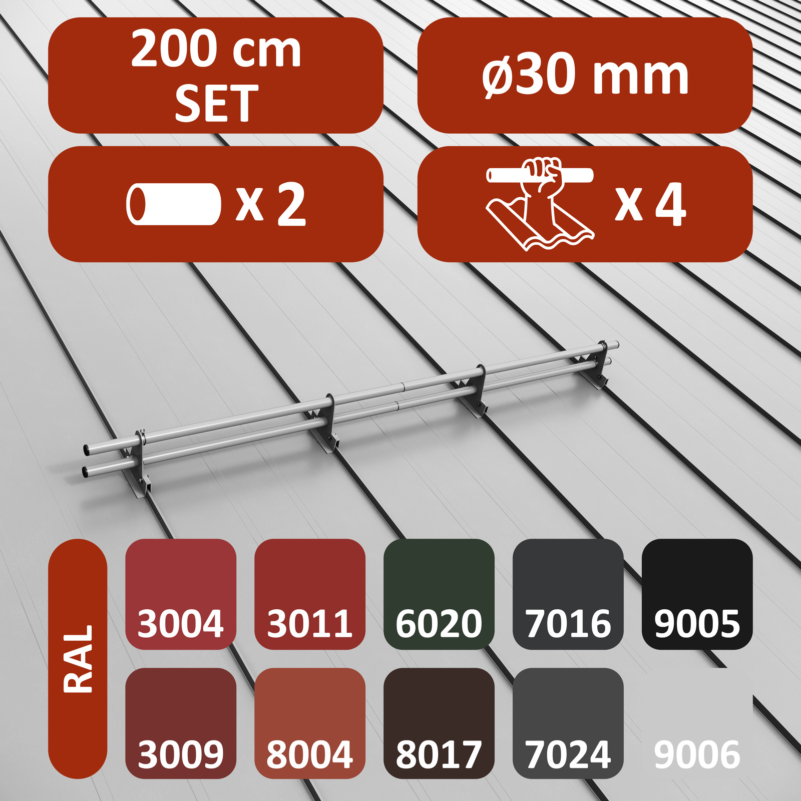 • Komplettes 2-Rohre Schneefangrohr für Stehfalzdächer (Doppel-/Winkelstehfalz, Klick-/Snapfalz)